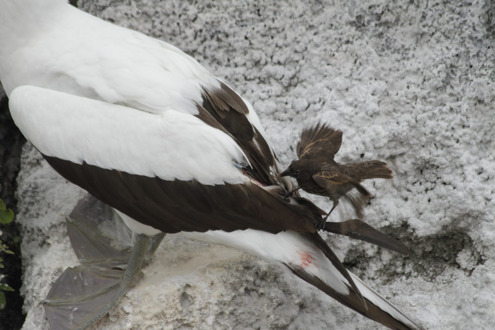 Κατά την εποχή της ξηρασίας, όταν οι παραδοσιακές πηγές τροφής και το γλυκό νερό είναι σε έλλειψη, οι σπίνοι των δύο νησιών αυτών έχουν προσαρμοστεί κατάλληλα και επιδεικνύουν μια μοναδική συμπεριφορά. Όπως ίσως έχετε μαντέψει ήδη, για να καλύψουν τις ανάγκες τους σε θρεπτικά στοιχεία, οι σπίνοι πίνουν το αίμα από άλλα (ευτυχώς μόνο) πουλιά. Εκτός από τους σπίνους, στα νησιά μένουν δύο είδη από θαλασσοπούλια που ονομάζονται σούλες. Οι σούλες φτιάχνουν τις φωλιές τους εκεί και τρώνε ψάρια που υπάρχουν άφθονα στον ωκεανό. Όταν όμως κλωσσούν τα αυγά τους και φροντίζουν τους νεοσσούς τους, οι σούλες είναι πολύ ευάλωτες, καθώς δεν εγκαταλείπουν ποτέ τη φωλιά τους. Τότε βρίσκουν ευκαιρία οι σπίνοι και τσιμπάνε το δέρμα από τις σούλες στη βάση των φτερών τους μέχρι να αρχίσει να τρέχει αίμα, το οποίο και ρουφούν. Οι σούλες δεν προβάλουν καθόλου αντίσταση, αν και ενοχλούνται από τους σπίνους. Αν η κατάσταση τους γίνει αφόρητη απλά φεύγουν. Για τις σούλες η αίσθηση είναι αντίστοιχη με το τσίμπημα ενός κουνουπιού. Οι σπίνοι δεν βλάπτουν τις σούλες, ενώ λαμβάνουν μια τροφή πλούσια σε σίδηρο και πρωτεΐνες.